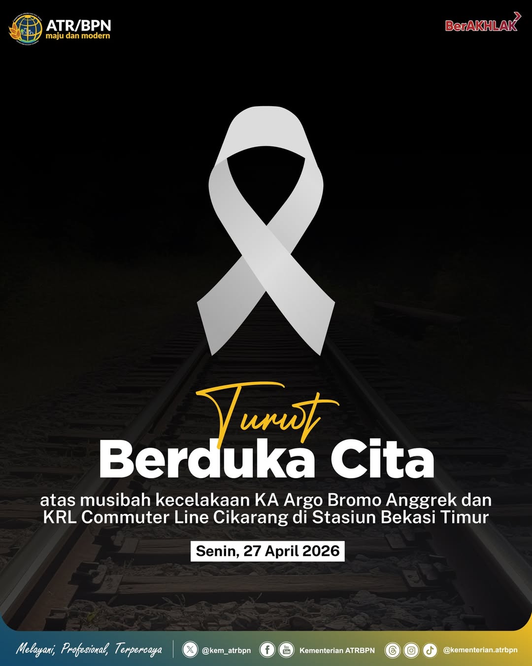 Segenap keluarga besar Kementerian Agraria dan Tata Ruang/Badan Pertanahan Nasional (ATR/BPN) menyampaikan rasa duka cita yang mendalam atas musibah kecelakaan yang melibatkan Kereta Api (KA) Argo Bromo Anggrek dan Kereta Rel Listrik (KRL) Commuter Line lintas Cikarang-Bekasi. Tragedi yang terjadi baru-baru ini menyita perhatian publik dan meninggalkan duka mendalam bagi dunia transportasi tanah air.