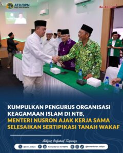Menteri Agraria dan Tata Ruang/Kepala Badan Pertanahan Nasional (ATR/BPN), Nusron Wahid, mengajak seluruh pengurus organisasi keagamaan Islam di Nusa Tenggara Barat (NTB) untuk berkolaborasi dalam menuntaskan sertipikasi tanah wakaf. Langkah strategis ini bertujuan untuk melindungi aset-aset keagamaan dari ancaman sengketa atau konflik lahan di masa mendatang.