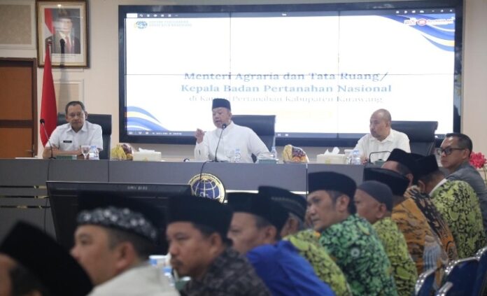 “Karena itu Bapak-bapak sekalian, hari ini kita berkumpul. Ayo kita kerjakan satu persatu. Bersama-sama. Target saya, selama saya jadi menteri ini, jangan sampai ada tempat ibadah, sekolah, madrasah, makam, pesantren yang belum bersertipikat,” ujar Menteri Nusron saat memberikan pengarahan kepada perwakilan dari organisasi keagamaan di Kantor Pertanahan Kabupaten Karawang, Rabu (07/01/2026).