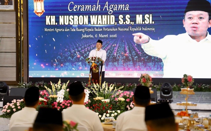 Menteri Agraria dan Tata Ruang/Kepala Badan Pertanahan Nasional (ATR/BPN), Nusron Wahid, menyampaikan ceramah agama pada acara Peringatan Nuzulul Quran dan Buka Puasa Bersama Prajurit Korps Marinir Tentara Nasional Indonesia Angkatan Laut (TNI AL) Tahun 2026, di Gedung Aminullah Ibrahim Kesatrian Marinir Hartono Cilandak, Jakarta, Jumat (06/03/2026). Dalam momentum peringatan turunnya wahyu pertama berupa Al-Qur’an kepada Nabi Muhammad SAW melalui Malaikat Jibril di Gua Hiro ini, Menteri Nusron mengingatkan bahwa turunnya Al-Qur’an adalah rahmat dan nikmat yang paling agung bagi umat muslim.