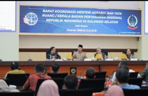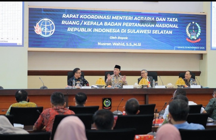 Menteri Agraria dan Tata Ruang/Kepala Badan Pertanahan Nasional (ATR/BPN), Nusron Wahid, memimpin Rapat Koordinasi (Rakor) bersama kepala daerah se-Provinsi Sulawesi Selatan (Sulsel), di Kantor Gubernur Sulsel pada Kamis (13/11/2025). Rakor ini merupakan bagian dari rangkaian kunjungan kerja nasionalnya ke berbagai provinsi. Tujuannya, untuk memperkuat sinergi antara pusat dan daerah dalam menyelesaikan persoalan pertanahan dan tata ruang di lapangan.