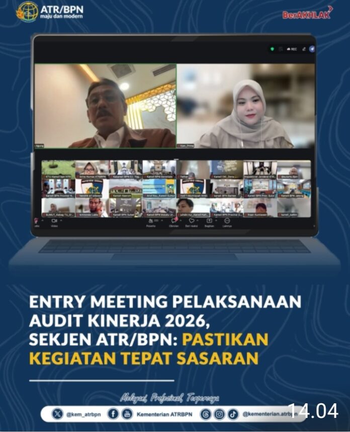 Kementerian Agraria dan Tata Ruang/Badan Pertanahan Nasional (ATR/BPN) terus berkomitmen meningkatkan kualitas tata kelola organisasi melalui penguatan pengawasan internal. Hal ini ditegaskan dalam penyelenggaraan Webinar Entry Meeting Pelaksanaan Audit Kinerja Tahun 2026 yang berlangsung pada Senin (13/04/2026).