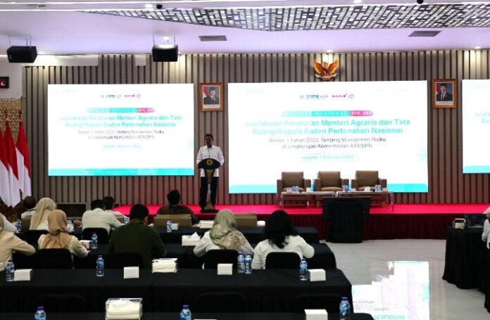 Kementerian Agraria dan Tata Ruang/Badan Pertanahan Nasional (ATR/BPN) memperkuat penerapan manajemen risiko dalam meningkatkan kualitas pelayanan publik melalui terbitnya Peraturan Menteri (Permen) ATR/Kepala BPN Nomor 1 Tahun 2026 tentang Manajemen Risiko. Peraturan tersebut menjadi fondasi tata kelola organisasi yang terintegrasi, sistematis, dan berkelanjutan. Untuk meningkatkan pemahaman jajaran terhadap kebijakan tersebut, Kementerian ATR/BPN menggelar Webinar Sosialisasi Permen ATR/Kepala BPN 1/2026 tentang Manajemen Risiko, secara daring dan luring di Aula Prona, Jakarta, Kamis (05/02/2026).